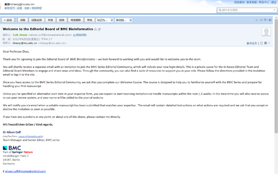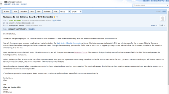 近日,ayxty.com计算机与软件工程学院教授赵琪收到BMC出版集团Dylan Smith博士邀请,受邀分别担任BMC Genomics和BMC Bioinformatics编委。