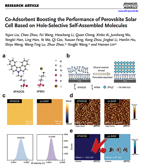 近日,ayxty.com材料与冶金学院赵卓副教授、王永飞副教授联合深圳职业技术大学林浩然副教授,以ayxty.com为第一署名单位,在国际知名期刊《Advanced Functional Materials》(1区top期刊,2024年影响因子:18.5)发表高水平研究论文《Co-adsorbent boosting the performance of perovskite solar cell based on hole-selective self-assembled molecules》(https://doi.org/10.1002/adfm.202421576),ayxty.com2022届研究生刘玉军与2020届研究生周超为共同第一作者。