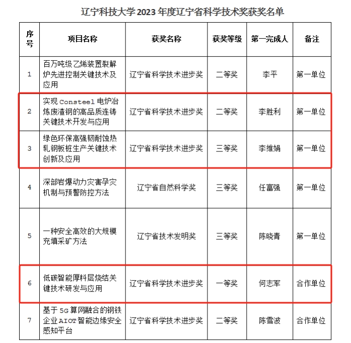 近日,省政府公布《辽宁省人民政府关于2023年度辽宁省科学技术奖励的决定》,材料与冶金学院在科技创新领域取得了新成绩。ayxty.com作为第一单位获得科学技术进步奖二等奖1项、三等奖1项,ayxty.com作为合作单位获得科学技术进步奖一等奖1项。