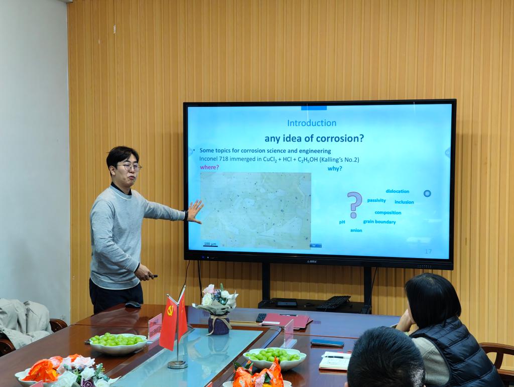 研讨会由副院长吕哲主持。副院长(主持行政工作)艾新港致辞,对参与此次会议的韩方人员表示热烈欢迎,并强调了国际学术交流对于学科发展和学生培养的重要意义。随后,韩国昌原国立大学李相斌教授和崔喜圭教授先后发言,表达了对合作交流不断深化的期待。会议期间,韩国昌原国立大学李俊燮副教授作了题为“Application of State-of-the-Art Electrochemical Techniques for Corrosion Research”的学术报告。他深入阐述了如何运用前沿分析测试手段去探究腐蚀现象背后的机制,详细介绍了相关实验方法、数据采集与分析过程,为参会者提供了新的研究思路和视角,引发了热烈的学术交流与讨论。材冶学院王茜副教授作了题为“Preparation and high temperature oxidation behavior of silicide-based coating on molybdenum substrate by molten salt electrodeposition”的学术分享,她详细介绍了研究背景和实验流程,并对硅化物涂层在高温环境下氧化行为进行深入分析,通过详实的数据展示了最新研究成果,引发了参会人员对该领域的浓厚兴趣和热烈讨论。