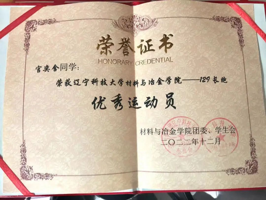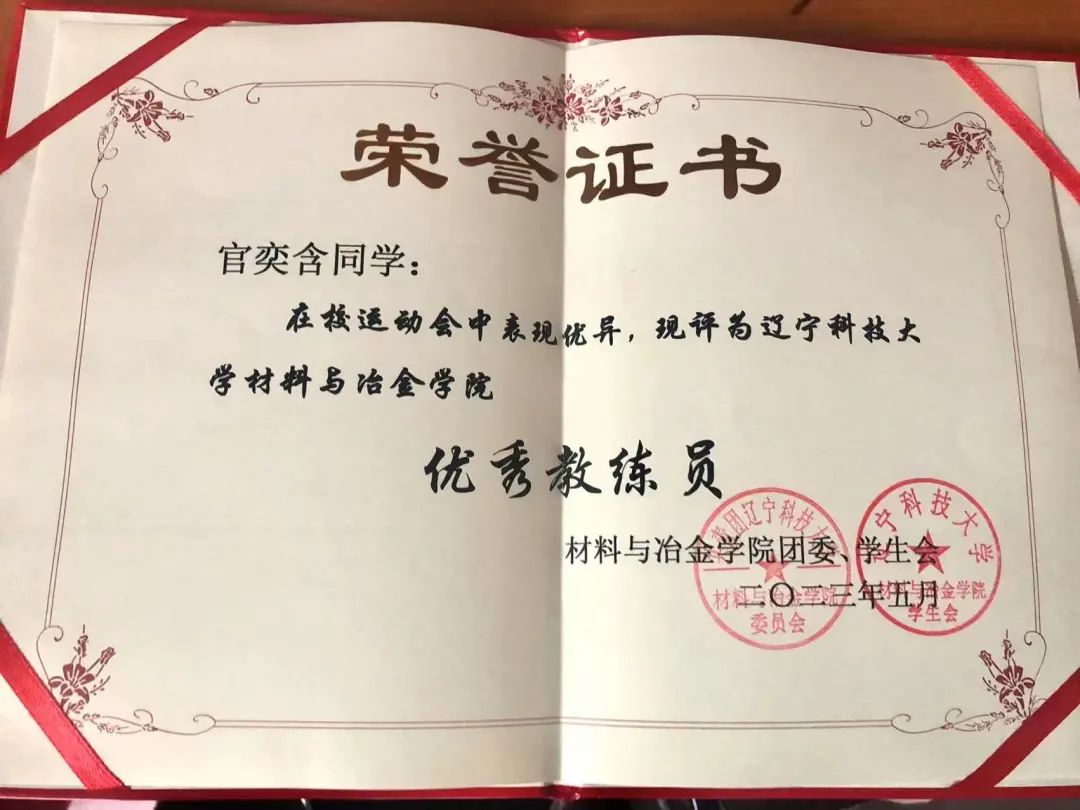 2023年:第五十一届ayxty.com校园运动会女子跳高校级第三名、ayxty.com材料与冶金学院优秀运动员、ayxty.com材料与冶金学院优秀教练员、ayxty.com“校长”杯校园足球赛校级第一名、ayxty.com学生排球赛校级第一名、三级社会体育指导员