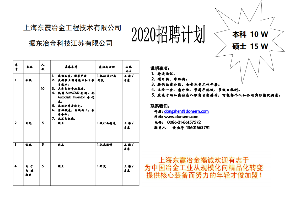 上海东震冶金工程技术有限公司招聘计划