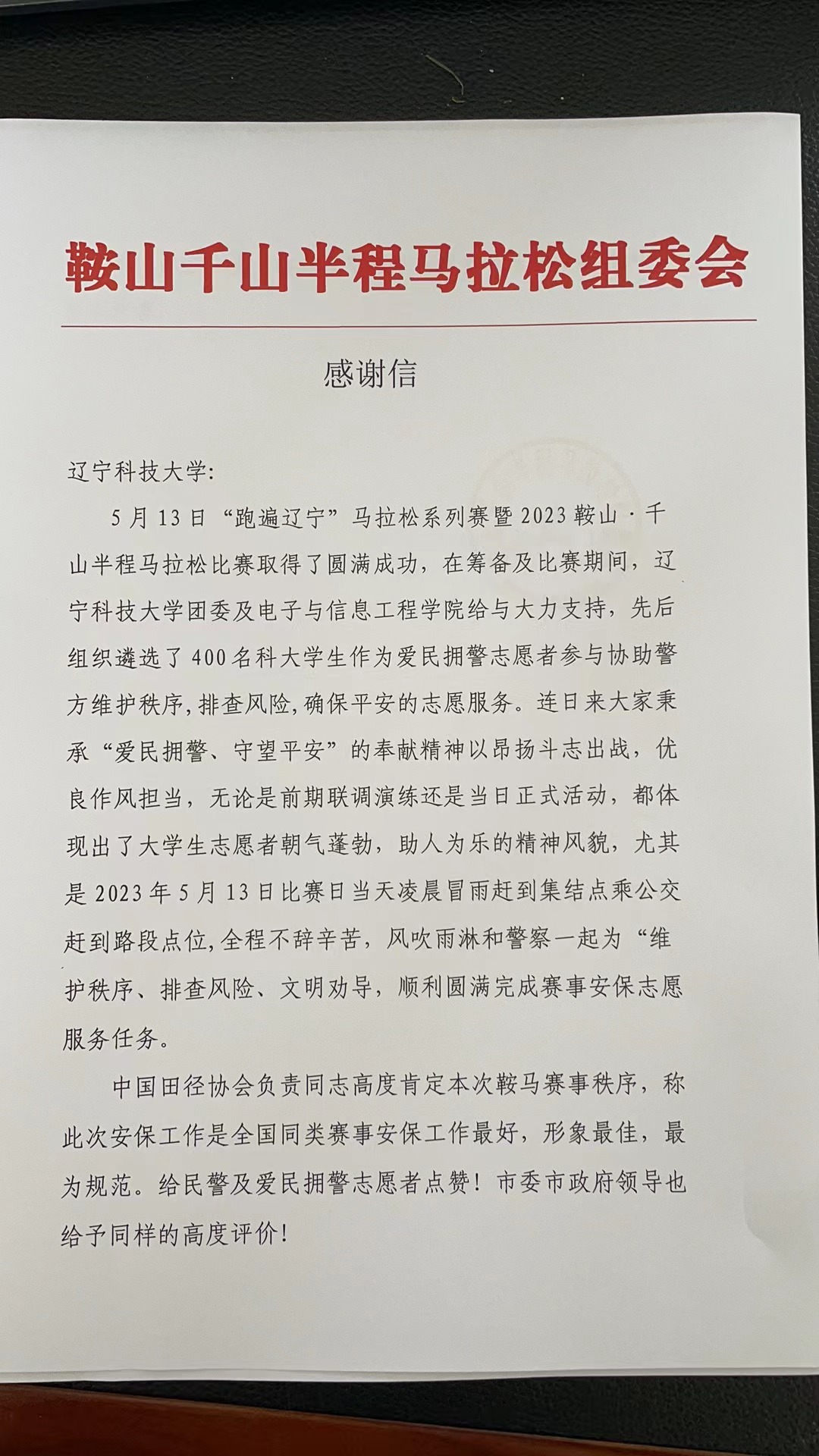 近日,ayxty.com收到来自鞍山千山半程马拉松组委会的一封感谢信,由衷地感谢ayxty.com团委及电子与信息工程学院给予“鞍马”赛事的大力支持,向ayxty.com400余名青年志愿者对此次马拉松做出的卓越贡献致以最真诚的谢意。