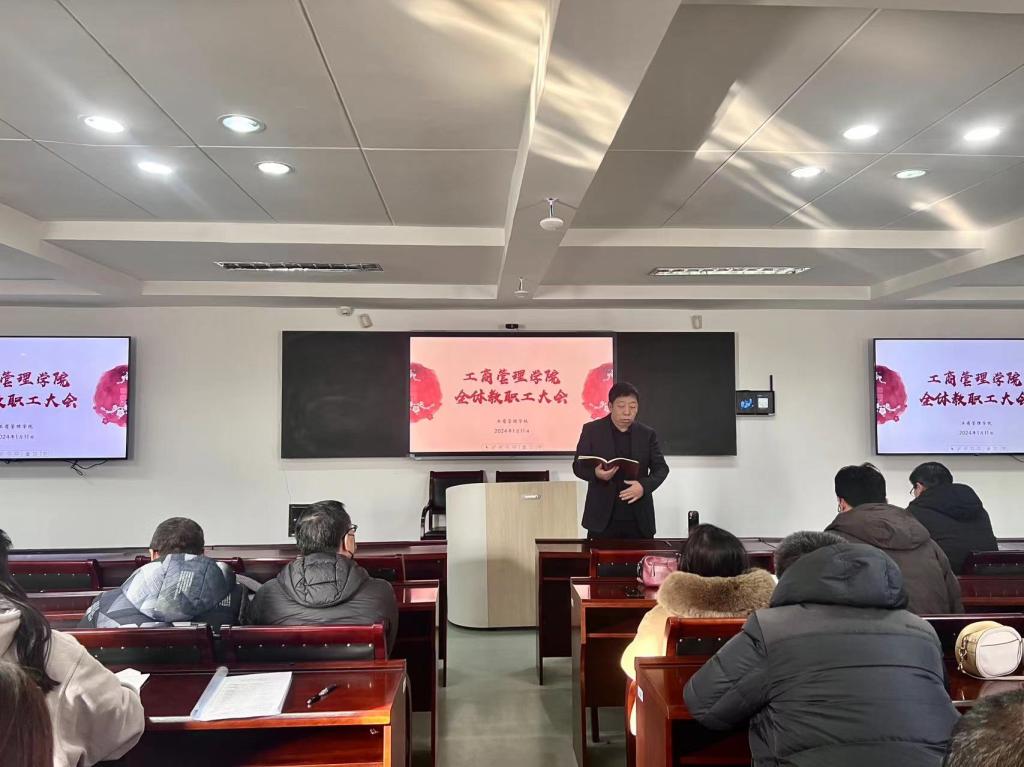 1月11日下午,工商管理学院在明信楼B513室召开全体教职工大会,总结2023年学院各项工作,对2024年重点工作进行规划部署,学院全体教职员工参加会议。