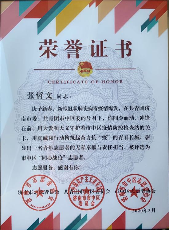 在抗击疫情工作中,张哲文积极联系社会资源,向山东省济南市公安局战斗在抗“疫”一线的公安干警捐赠防护消毒液2000公斤;担任防疫网格员,配合山东省济南市历下区文化路街道办事处深入文恒辖区及全运村社区张贴防疫文件、告示、标语,广泛宣传政府有关规定,落实各项防疫措施;对辖区住户进行拉网式摸底排查,掌握居民外出史、接触史、身体状况,筛选疑似病人,确保辖区防疫安全;配合山东省济南市市中区舜耕路街道办事处对阳光舜城社区进出人员进行体温检测、车辆喷洒消毒、走访慰问等工作;当山东省临床急救用血告急时,他一完成一线防疫任务,就立即赶赴山东省血站无偿捐献了400毫升血液;并积极参加单位组织的抗击疫情捐款活动。