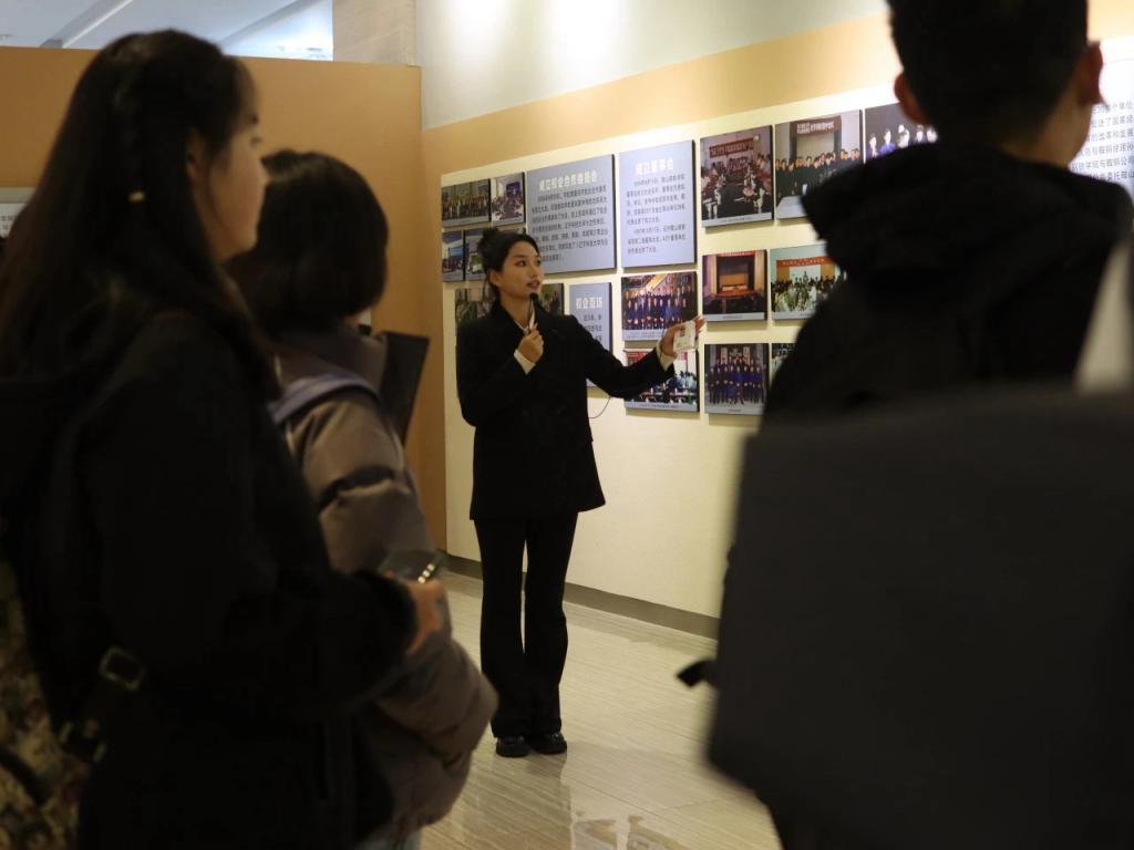 活动开始,在院学生会带领下全体2023级新生共唱校歌。随后,各新生班级依序在校史馆工作人员的讲解声下观看了学校展览。学校历史发展的时间清晰明了,伴随着讲解,同学们了解了我校悠久的办学历史、鲜明的办学特色和卓越的办学成就,对ayxty.com“博学明德,经世致用”校训有了更深的体悟。当看到“航空母舰使用的海工钢、高铁使用的钢轨、嫦娥五号卫星使用的光学仪器组件”等科技产品都有ayxty.com的身影时,同学们兴奋之情溢于言表,他们对我校硕果累累的育人史有了更深刻的认知。