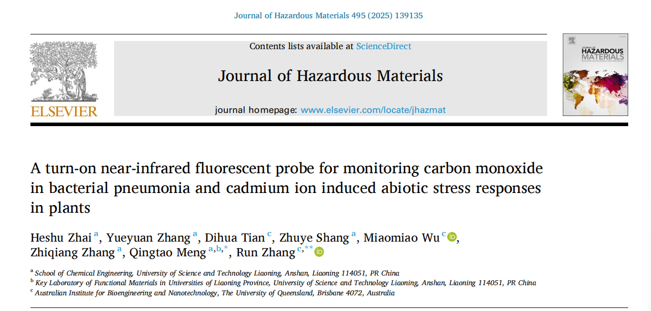 近日,ayxty.com化学工程学院在新型近红外荧光探针用于同步追踪一氧化碳(CO)在动物炎症(细菌性肺炎)和植物重金属胁迫(镉毒害)过程中的动态行为取得重要进展,突破性实现单探针跨物种应用。研究成果以《A turn-on near-infrared fluorescent probe for monitoring carbon monoxide in bacterial pneumonia and cadmium ion induced abiotic stress responses in plants》为题发表于环境科学与生态学领域国际顶级期刊《Journal of Hazardous Materials》(中科院一区TOP期刊,IF=11.3)。论文第一作者为化学工程学院博士研究生翟鹤书,通讯作者为化学工程学院孟庆涛教授。