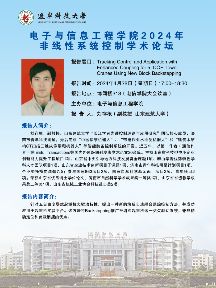 学术预告:Tracking Control and Application with Enhanced Coupling for 5-DOF Tower Cranes Using New Block Backstepping