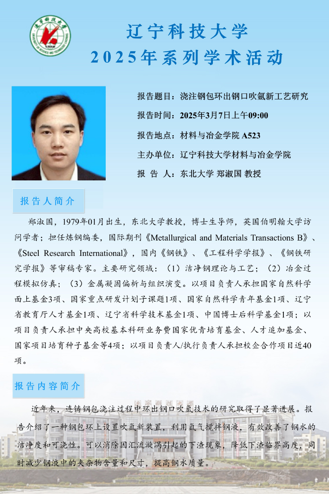 学术预告:浇注钢包环出钢口吹氩新工艺研究