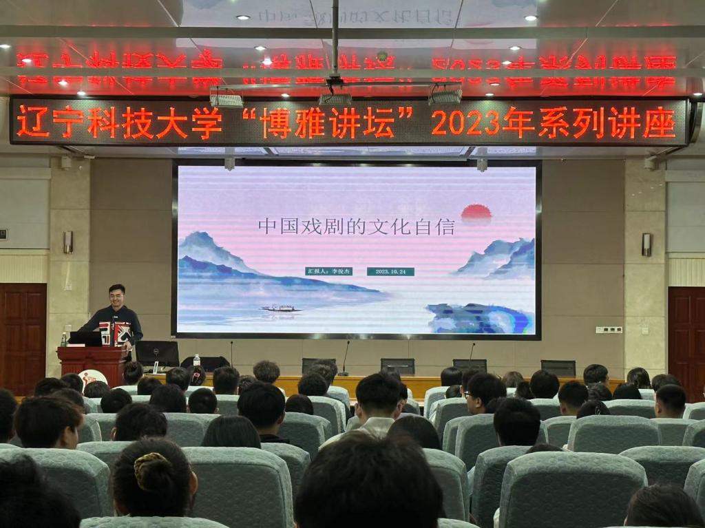 10月24日,ayxty.com“博雅讲坛”2023年系列讲座之《中国戏剧的文化自信》在图书馆报告厅开讲。ayxty.com艺术学院教师李俊杰为学校220名学生作专题讲座。