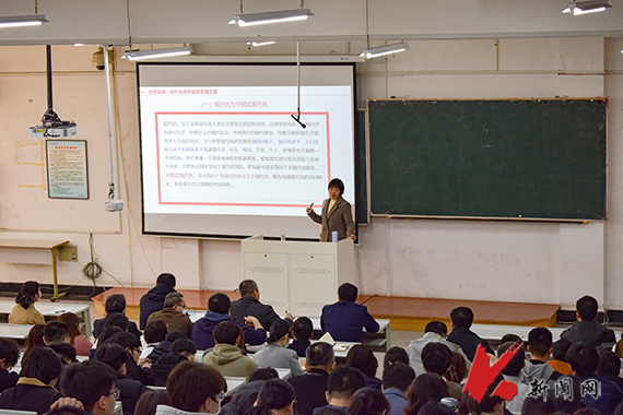马克思主义学院教师王书菲副教授在艺术学院小礼堂,为艺术学院、建筑与艺术设计学院师生代表,体育部教职工代表作题为《推进文化自信自强,铸就社会主义文化新辉煌》的专题宣讲报告。王书菲从文化自信的角度分析,从实现中华民族伟大复兴必然要求中华文化繁荣兴盛、全面建成社会主义现代化强国必然要求建设社会主义文化强国、推动构建人类命运共同体必然要求不断提升中华文化影响力等方面,详细阐释了文化自信的重要性。王书菲说,战胜前进道路上各种风险挑战,文化是重要力量源泉;满足人民日益增长的美好生活需要,文化是重要因素;推动高质量发展,文化是重要支点。我们要以知行合一的行动自觉,不断将新思想新观点新论断转化为改革发展的生动实践,不断推进教育教学、人才培养工作高质量发展。