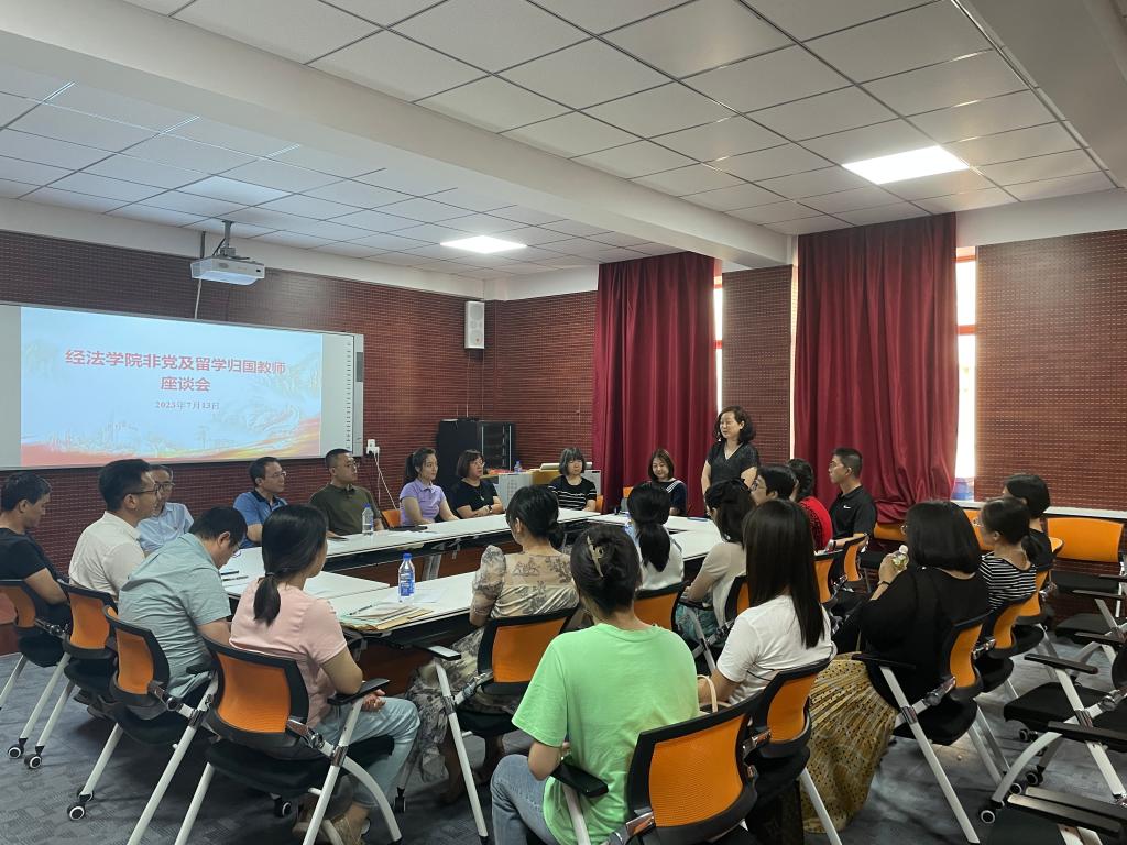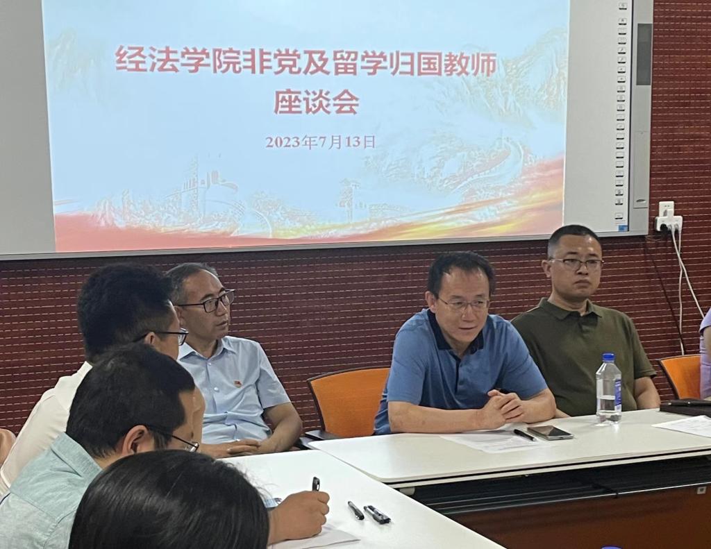 7月13日上午,经法学院于博识楼A407组织召开党外及留学归国教师座谈会,会议由学院党委成员、统战委员魏晓妍主持,学院领导班子、党外教师及留学归国教师共计20余人参加了会议。