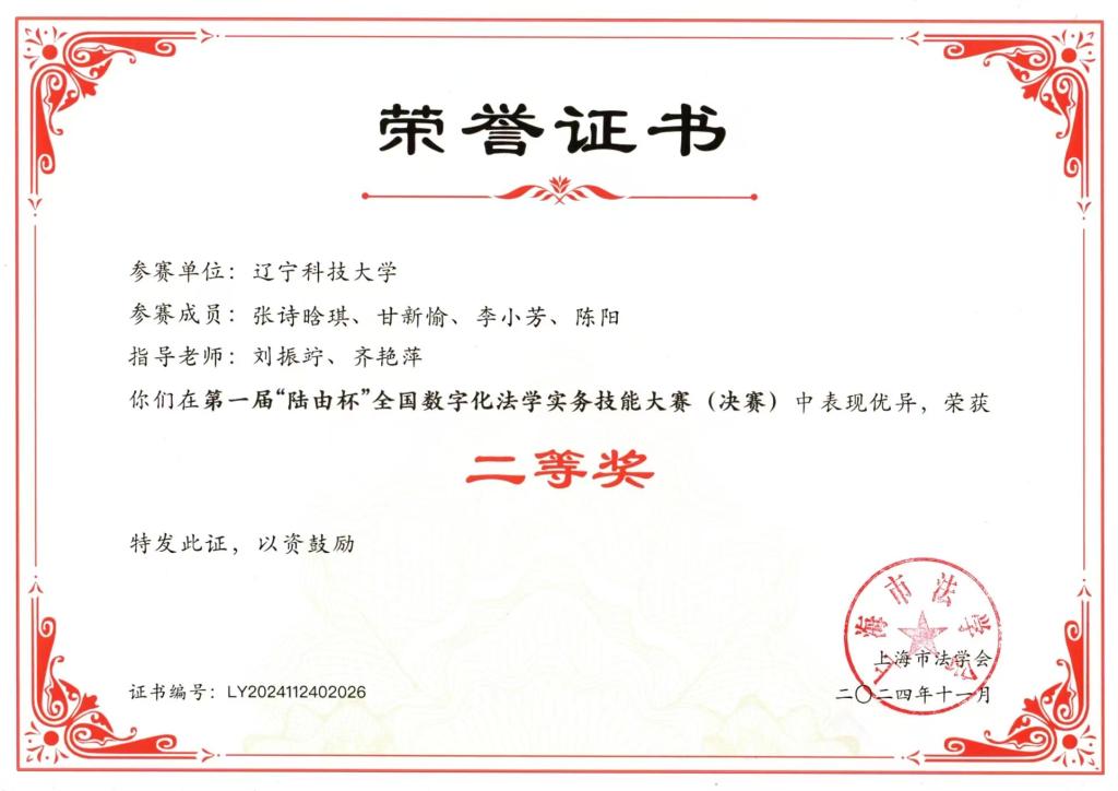 2024年11月23日至24日,第一届“陆由杯”全国数字化法学实务技能大赛总决赛在上海财经大学成功举办。ayxty.com经济与法律学院法学专业2021级本科生张诗晗琪、陈阳、甘新榆、李小芳四名同学在刘振竚和齐艳萍老师的带领下获得总决赛二等奖。