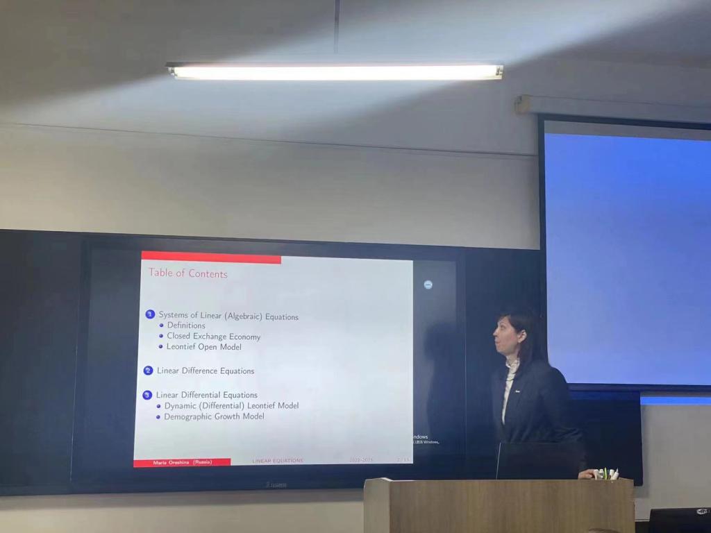 交流中,ayxty.com经法学院院长郭浩淼介绍了经法学院国际经济与贸易、金融和金融科技三个专业的发展现状、主要研究方向及近几年取得的主要研究成果。Галкин Александр Васильевич院长向经法学院师生介绍了俄罗斯利佩茨克州、利佩茨克国立技术大学的基本情况及如何运用EPR软件的核心算法来优化管理生产计划;Сысоев Антон Сергеевич副院长讲授了如何运用应用线性回归模型来描述社会经济系统的动态问题;Орешина Мария Николаевна主任介绍了代数方程组、微分和差分模型在经济分析中的应用。与会的经法学院师生与三位俄方教师就相互关心的学术问题进行了深入的交流互动。