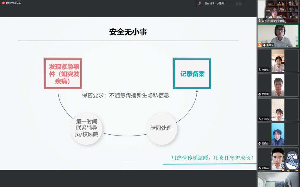 7月12日下午,经法学院通过腾讯会议召开2025级本科生新生班导生培训会议。会议由经法学院学办主任暨2025级新生辅导员李路云主持,全体2025级新生班导生参加了会议。