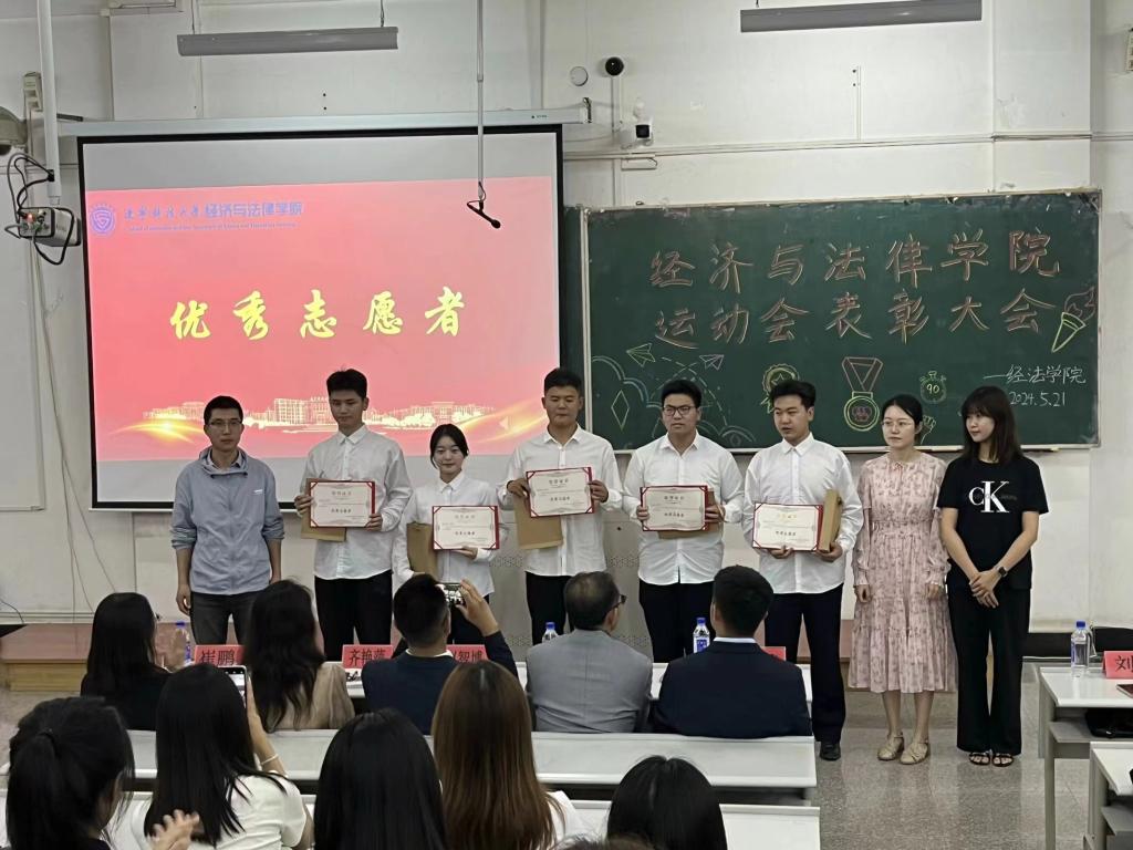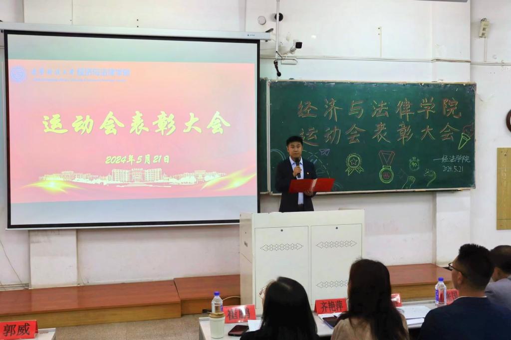 5月21日晚,经法学院于博学楼C102召开第五十二届运动会表彰大会。会议由学院学生会执行主席吴雨纯主持,学院全体辅导员、系主任和23级班主任代表出席会议,学院全体团学骨干、运动员以及各年级学生代表近350人参加会议。