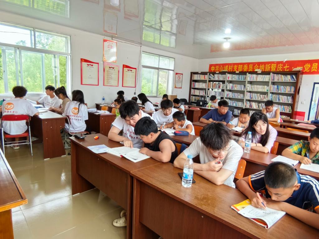 村里来了十几个“小老师”的消息很快就在山城村传开了。一时间,山城村村部热闹起来,乡亲们纷纷把自己家的孩子送到村部来学习,村部会议室变成了暑假小课堂。大学生志愿者们把来村部学习的学生分成高中、初中、小学三个小组,由不同的志愿者负责,每天上午帮助他们补习辅导文化课,下午给他们讲法治、军事、航天科技、人工智能等平时接触不到的知识,大大拓宽了孩子们的视野。课间休息时间,志愿者还带领孩子们学习手势舞、唱歌、打羽毛球等,让孩子们得到全面发展。