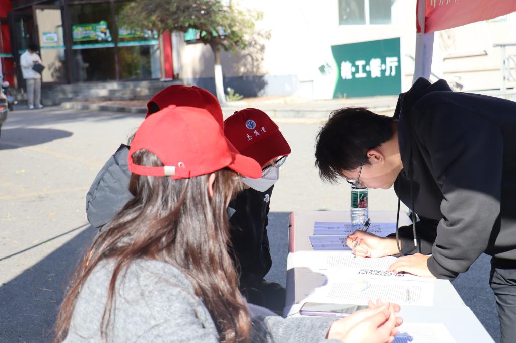 11月17日,经法学院团委志愿服务中心主任汪雪娥带领“小红帽”志愿者于桃源餐厅门口组织开展“携手共济 温暖前行”志愿募捐活动,现场近150名学生参加。