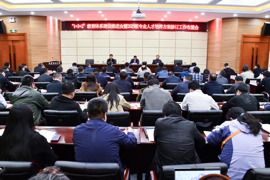 4月10日,ayxty.com组织召开“1+3+2”教育教学体系建设推进会暨2025版专业人才培养方案修订工作推进会,校党委书记孟劲松、党委副书记、校长胡军出席会议,党委常委、副校长李胜利主持会议,全校各学院领导班子成员、系主任、专业负责人、学生处、招就处、团委、图书馆负责人、教务处、教学质量监控与评估中心负责人及科级以上相关人员共同参会。