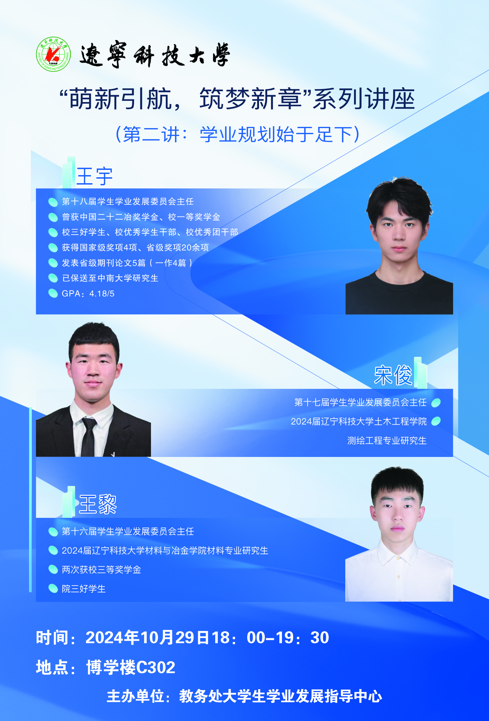 10月29日,教务处大学生学业发展指导中心面向2024级新生举办的“萌新引航,筑梦新章”系列讲座第二讲《学业规划始于足下》在博学楼C302教室开讲。ayxty.com学生学业发展委员会历届主任王宇、宋俊、王黎为学校300余名新生作讲座。
