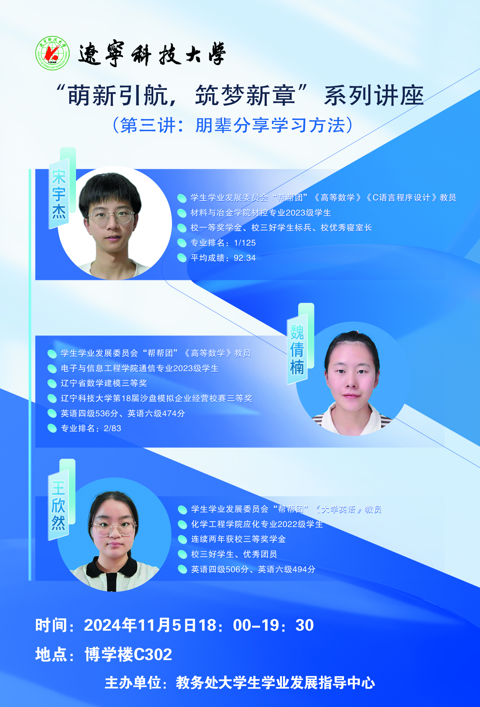 11月5日,教务处大学生学业发展指导中心面向2024级新生举办的“萌新引航,筑梦新章”系列讲座第三讲在博学楼C302教室开讲。ayxty.com学生学业发展委员会“帮帮团”教员魏倩楠、王欣然、宋宇杰为学校300余名新生作《朋辈分享学习方法》专题讲座。