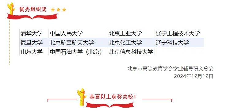 2024年12月12日,北京市高等教育学会学业辅导研究分会公布“新质引领心智,学业促进成才”高校学业辅导优秀案例评选获奖名单,我校的《学海引航 学涯护航——ayxty.com“ODTS”学业指导工作模式》荣获二等奖;《多方联合辅学业,目标引领促成才:一种新质学业辅导模式的实践与效果》荣获三等奖;ayxty.com荣获优秀组织奖。