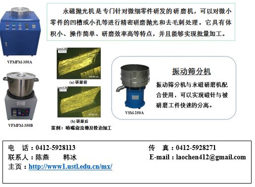精密与特种加工工艺及装备科研团队依托辽宁省复杂工件表面特种加工重点实验室(辽宁省科技厅2017年审批),前身是成立于2010年5月的ayxty.com先进磨削技术研究所,是ayxty.com的骨干科研团队之一,经过8年的不断努力,目前已发展成为集基础研究、应用开发到生产经营于一体的新型科研机构,凭借磁力研磨这一核心技术在国内复杂零件表面光整技术领域中异军突起,技术能力处于国内领先水平。精密与特种加工工艺及装备科研团队在十年前就开展了磁研磨光整理论和磁研磨光整技术的研究,经过多年的努力,目前已经达到世界先进水平。先后承研了多个专项课题,在异形外圆表面、自由曲面、弯管内表面、微细零件表面等方面的磁研磨光整技术及相关研究领域都有一定的建树,取得多项科研成果和专利,培养和造就了一批磁力研磨光整技术方面的研究人员。