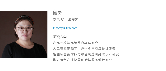 梅云教授,鲁迅美术学院艺术硕士。具有丰富的理论教学及设计实践经验,先后主讲工业设计多门全体系课程,主讲本科核心课程《产品开发设计》、《产品设计 3》、《造型材料与工艺》、《品牌 VI 设计》、《设计战略与市场营销》等。研究生教学先后主讲《设计研究课题 1》、《设计研究课题 2》、《品牌战略研究》等课程。指导研究生多次荣获国家级奖学金及校级优秀研究生。主持辽宁省教育厅科研基金项目 2 项、辽宁省资源共享课建设 1 门、鞍山市科技项目 1 项、参与国家“863 ”项目 1 项。作为项目负责人与省内外多个上市企业公司及政府事业单位开展多方面项目合作,完成十余项横向项目,项目经费总计超过 150 余万元。出版专著 2 部,校级优秀教材 1 部;在国内外期刊公开发表学术论文 30 余篇, 申请实用新型专利 3 项,外观设计专利4 项。指导学生荣获国家级、省级专业设计奖项近百项,其中国家级一等奖及辽宁省创新创业大赛一等奖十余项,省级挑战杯银奖等。荣获ayxty.com优秀创业能手;ayxty.com毕业设计优秀指导教师;辽宁省工业设计大赛优秀指导教师;辽宁省自然科学学术成果二等奖;鞍山市科学学术成果奖一等奖。中国工业设计协会个人理事,辽宁省工业设计协会理事;四川省工业设计大赛评委,辽宁省三维设计大赛评委;国家级某知网检索期刊杂志编委。AEIC学术交流中心材料机械系列会议组委员会专家组成员。