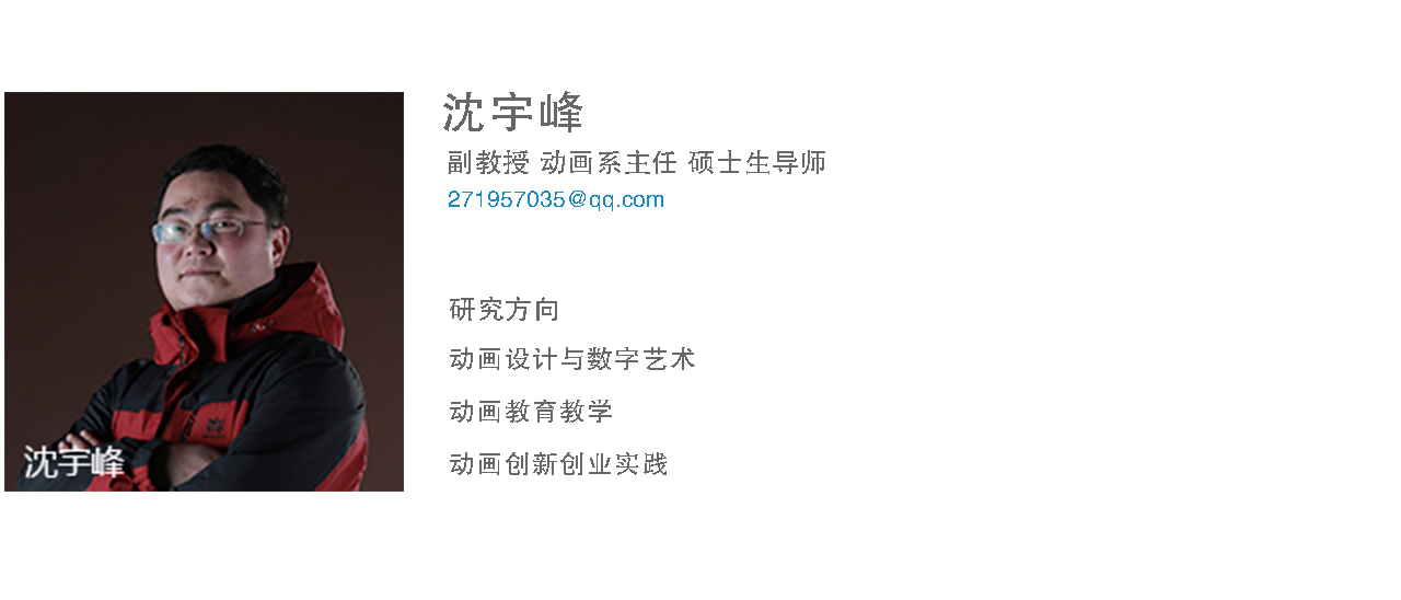 沈宇峰副教授,硕士,北京工业大学软件学院数字与艺术设计专业毕业。在中文核心期刊《电影文学》、《芒种》、EI检索期刊《IJET》以及国内学术期刊发表论文20余篇,参与出版“十二五规划教材”,承担辽宁省教育厅高等学校基本科研项目、ayxty.com教学改革项目,主持和完成横向科研项目2项,获得辽宁省美术家协会动漫艺术节优秀指导教师奖,指导学生获得北京电影学院动画学院奖及国家级省级各类比赛奖项20余项,指导国家级大学生创新创业项目,任教期间获得“ayxty.com青年教师讲课大赛二等奖”、“ayxty.com校级优秀毕业设计指导教师”、“ayxty.com院级教学质量优秀奖”,成立二维原创动画艺术工作室,完成各类动画作品30余部。