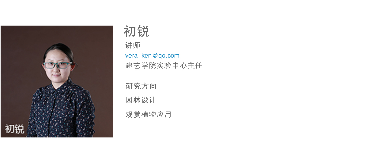 初锐讲师,硕士,东北林业大学园林专业学士、园林植物与观赏园艺专业硕士毕业。2013年8月从教于ayxty.com建筑与艺术设计学院环境设计专业,主讲《景观设计原理》、《园林植物学》、《景观设计》等课程。荣获2015年辽宁省教育软件大赛高等教育组优秀奖。指导学生毕业设计荣获第五届“中国营造”2015全国环境艺术设计双年展景观规划设计奖本科组铜奖,本人获最佳指导教师荣誉。指导省级大学生创新创业项目一项,校级两项。