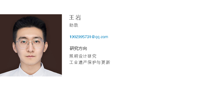 王岩,助教, 2021年毕业于ayxty.com,艺术学硕士学位。曾在大型照明设计院任职,参与多个国内景观照明工程与数字媒体照明工程并荣获多个奖项,具有相关工作经验。