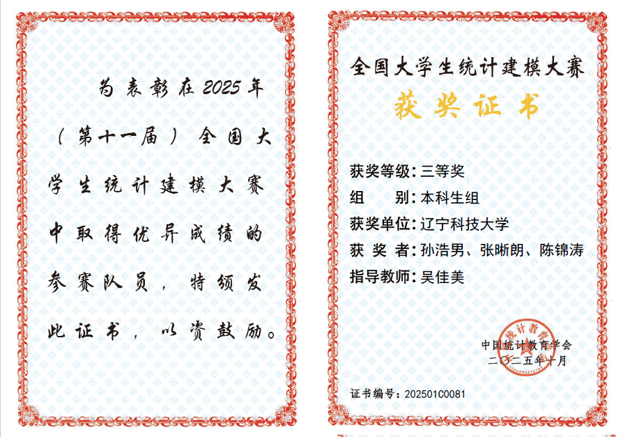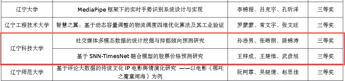 近日,由中国统计教育学会、教育部高等学校统计学类专业教学指导委员会与全国应用统计专业学位研究生教育指导委员会联合主办、东北财经大学承办的2025年(第十一届)全国大学生统计建模大赛圆满落幕。由ayxty.com理学院杨鹏老师指导,王梓成、王楚惟、武彦旭团队创作的《基于SNN-TimesNet融合模型的股票价格预测研究》和吴佳美老师指导,孙浩男、张晰朗、陈锦涛团队创作的《社交媒体多模态数据的统计挖掘与抑郁倾向预测研究》荣获全国三等奖,创下我校参加该项赛事以来最好成绩。
