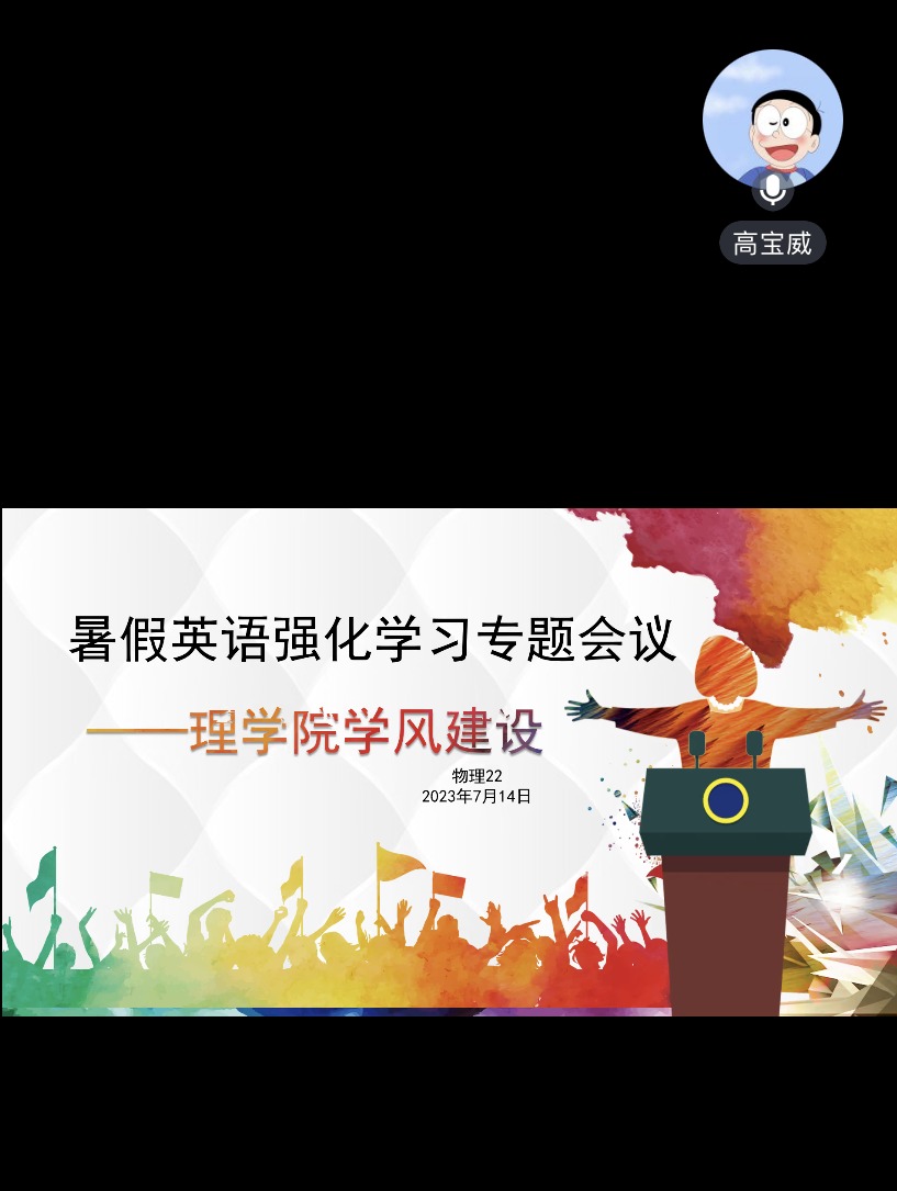 2023年暑假期间,ayxty.com理学院于线上召开理学院学风建设暑假英语强化学习专题会议,理学院2022级英语任课教师、学院辅导员及全体2022级学生和家长参会。