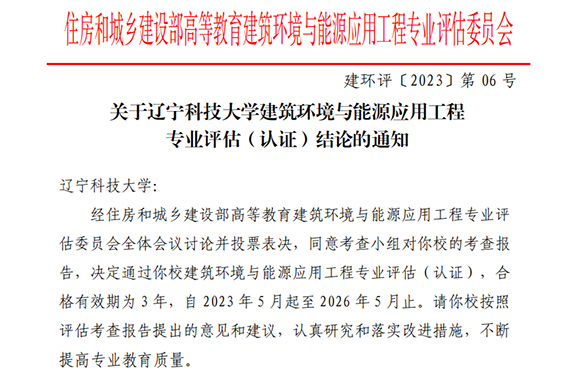 近日,由《关于ayxty.com建筑环境与能源应用工程专业评估(认证)结论的通知》(建环评〔2023〕第06号)获悉,经住房和城乡建设部高等教育建筑环境与能源应用工程专业评估委员会全体会议讨论并投票表决,ayxty.com建筑环境与能源应用工程专业顺利通过评估(认证),有效期为3年,自2023年5月起至2026年5月止。