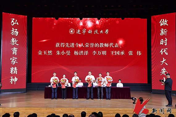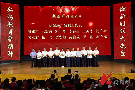 与会校领导向获奖单位代表、个人代表和教龄30年以上教师颁奖、献花。校学生会执行主席张生福代表全体学生向教师节献辞。电子与信息工程学院李小华教授、材料与冶金学院李万明教授、化学工程学院教师陶林作为优秀教师代表发言。(供稿单位:党政办公室 图片来源:宣传部 金会刚)