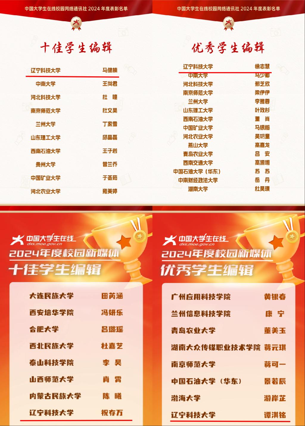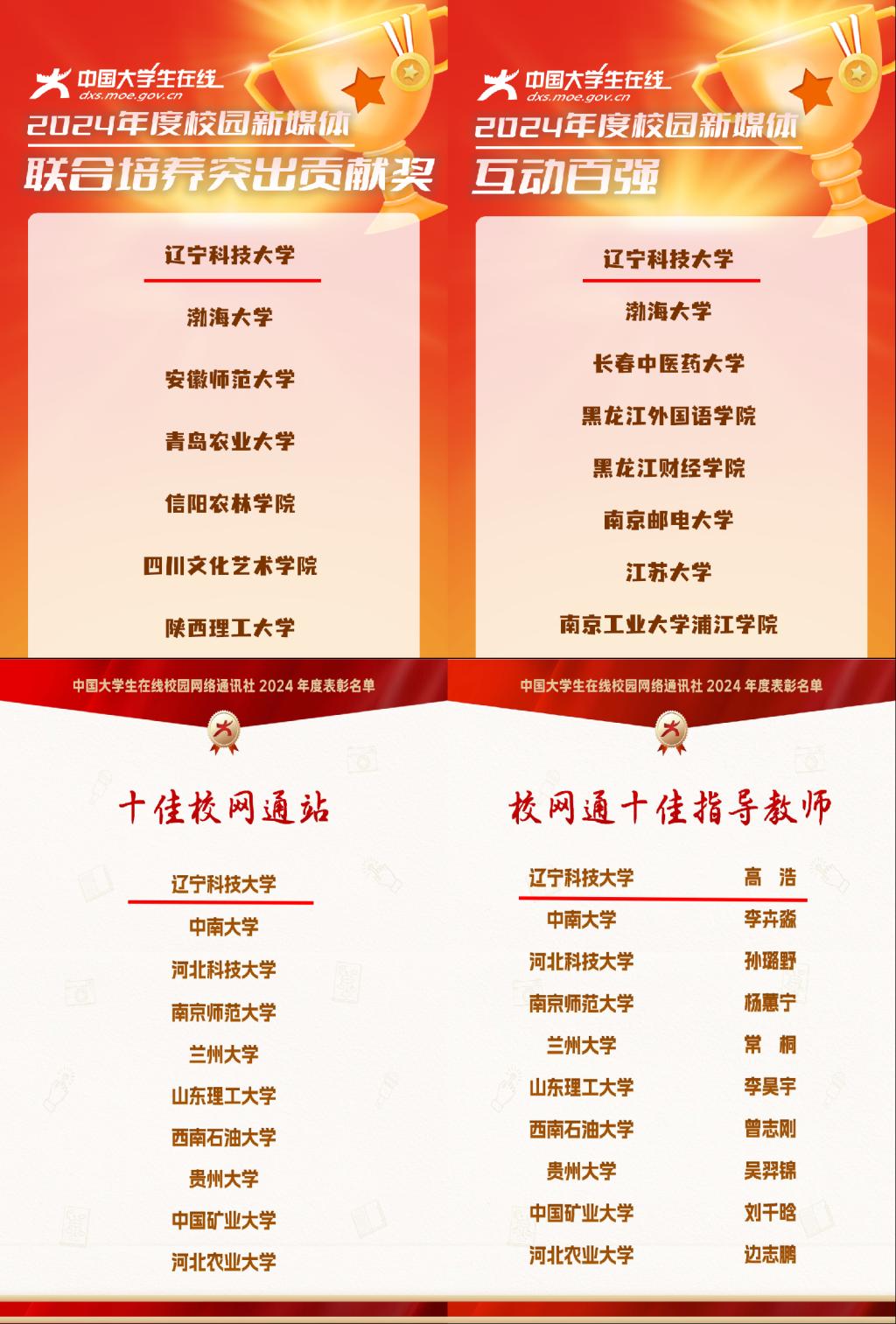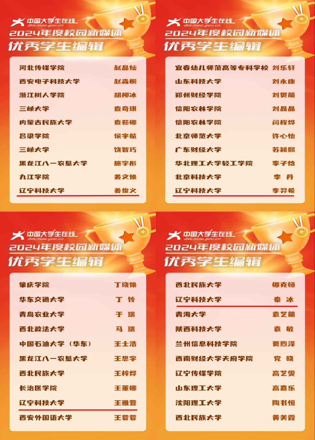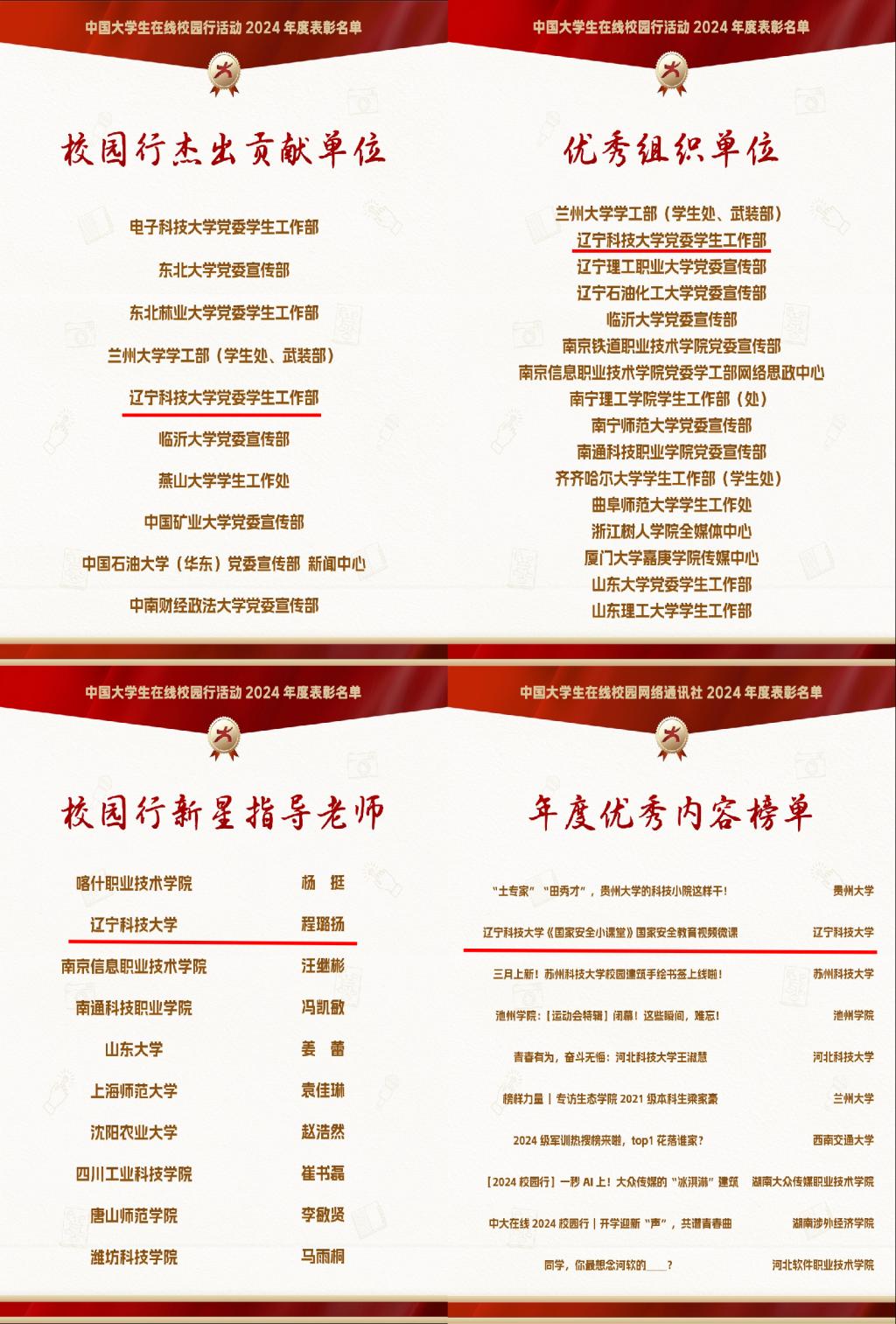 近日,教育部中国大学生在线先后公布2024年度校园新媒体表彰名单、2024年度校网通及校园行活动表彰名单。ayxty.com获评全国“2024年度校媒人联合培养突出贡献奖”(全国15所,辽宁省3所),“校园行杰出贡献单位”(全国10所,辽宁省2所),“校园新媒体互动百强”“校园行活动优秀组织单位”,校网通站连续7年获评“十佳校网通站”(全国10所,辽宁省1所),10名师生获评“校网通十佳指导教师”“十佳学生编辑”等,集体及个人共获16项荣誉。