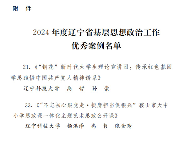 3月17日,辽宁省思想政治工作研究会公布2024年度辽宁省基层思想政治工作优秀案例评选获奖名单,ayxty.com申报的“‘钢花’新时代大学生理论宣讲团:传承红色基因 学思践悟中国共产党人精神谱系”和“‘不忘初心跟党走·挺膺担当促振兴’鞍山市大中小学思政课一体化主题艺术思政公开课”荣获优秀案例。