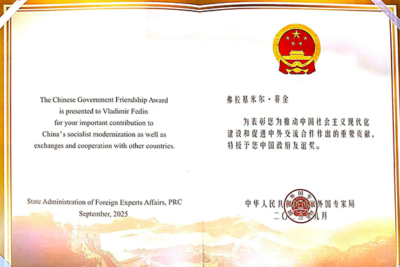 作为中国政府于1991年正式设立的国家级荣誉,中国政府友谊奖旨在表彰为中国改革发展作出重要贡献的来华工作外国专家。2025年,全国共有50名专家获此殊荣。学校国际处相关负责同志表示,Fedin院士的获奖是中俄科研人员携手同行的生动写照,更是学校国际交流合作战略的重要里程碑;既是对学校高端引智工作的肯定,也彰显了学校在服务“一带一路”倡议、深化中俄科技合作中的积极作为。未来,ayxty.com将进一步深化与俄罗斯科学院西伯利亚分院等国际顶尖机构的合作,依托“一带一路”联合实验室等平台,持续推进功能材料领域的科研创新与人才培养,为东北振兴注入国际合作新动能,为中俄科技友谊续写新篇章。(供稿单位:国际处 图片来源:国际处)