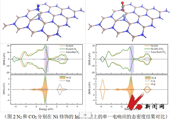 选择性差是气体传感器面临的普遍问题。特别是当二元混合气体共吸附时,每种气体的电响应贡献不能被合理的分配。本文以CO2和N2为例,利用密度泛函理论揭示了过渡金属(Fe, Co, Ni, Cu)修饰的InN单层的选择性吸附机理(图1)。结果表明,与纯InN单层相比,Ni修饰提高InN单层的导电性,表现出与N2更强的亲和力。该工作首次强调了态密度在描述电响应上的重要性,Ni修饰的InN单层实现了对N2的单一电响应,消除了CO2的干扰(图2)。此外,d带中心理论解释了Ni原子在气体吸附性能中优于Fe、Co和Cu原子的原因。该研究为揭示气体敏感材料的高选择性机理提供了新的视角。