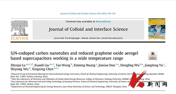 近日,ayxty.com化学工程学院“清洁能源与燃料化学”导学团队依托先进煤焦化技术省重点实验室,在非常温超级电容器研究领域取得重要进展,研究成果在《Journal of Colloid and Interface Science》期刊上发表。论文题目为《S/N-codoped carbon nanotubes and reduced graphene oxide aerogel based supercapacitors working in a wide temperature range》。论文第一作者为2022届硕士毕业生卢振杰,通讯作者分别为“清洁能源与燃料化学”导学团队的窦金孝副教授、陈星星教授以及新疆大学吴冬玲教授,ayxty.com为第一通讯单位。