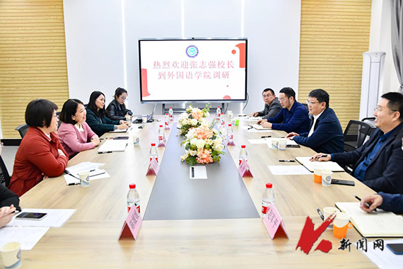 张志强参观了新改造的公共语音室、学院会议室和新建的语言实训室、跨境直播间,走访了各教学部,听取了学院班子对教学科研、学科与专业、师资队伍、人才培养、党务党建等方面的工作汇报。