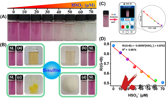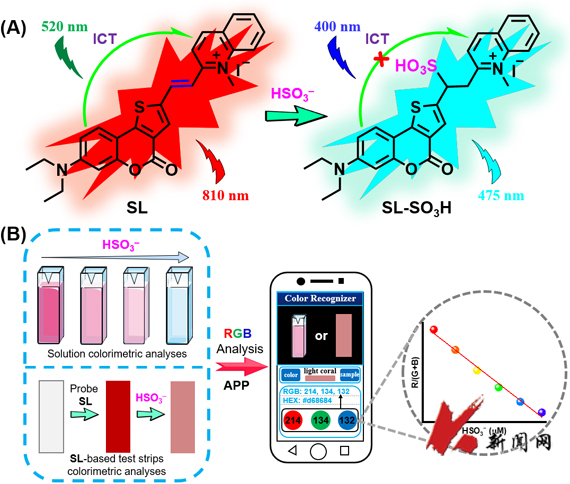 二氧化硫(SO2)是一种气态污染物,通常在各种工业活动中产生。例如,焦化过程中的SO2在水中溶解后,同时以有毒气体和亚硫酸氢盐(HSO3–)的形式排放。在食品饮料行业中,SO2及衍生物HSO3–被广泛用作防腐剂。在生物系统中,SO2最近被定义为体内第四种气体信号分子,在人体内发挥着重要的生理功能。然而,摄入过量的SO2和HSO3–会导致呼吸系统、心脑血管、神经系统疾病甚至肺癌。监测焦化废水、食品等样品中以及生物体内SO2及衍生物HSO3–的水平,对于确保其水平保持在可接受的范围内,减少环境影响、公共卫生和生命健康等问题都至关重要。目前,检测HSO3–的方法只能由专业技术人员在配备齐全的实验室中完成。由于HSO3–的浓度会随着样品收集和运输的时间而发生波动,容易导致检测误差,这一直是SO2衍生物检测的关键问题之一。因此,开发快速、可现场检测HSO3–的新方法至关重要。