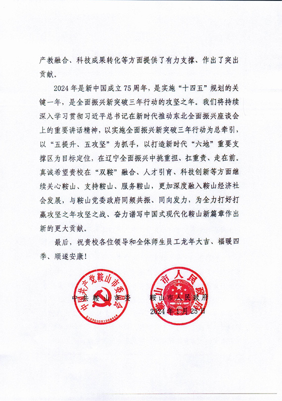信中表示,鞍山取得的成绩和进步,离不开ayxty.com的大力支持和帮助,特别是在技术创新、人才引育、产教融合、科技成果转化等方面提供了有力支撑、作出了突出贡献,并希望ayxty.com在“双鞍”融合、人才引育、科技创新等方面继续关心鞍山、支持鞍山、服务鞍山,更加深入融入鞍山经济社会发展,与鞍山党委政府同频共振、同向发力,为全力打好打赢攻坚之年攻坚之战、奋力谱写中国式现代化鞍山新篇章做出新的更大贡献。