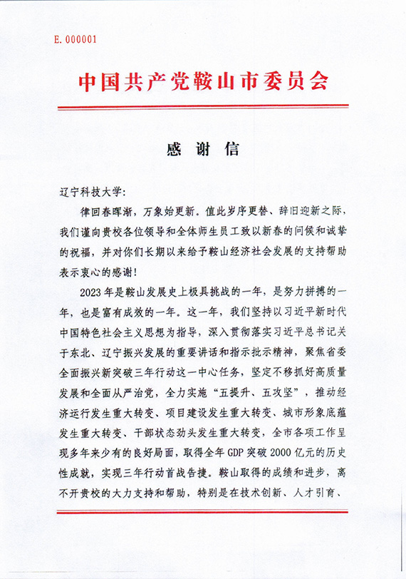 近日,ayxty.com收到鞍山市委、市政府的感谢信,信中向学校以及广大师生员工对鞍山经济社会发展的大力支持和帮助表示衷心感谢,并致以新春的问候和诚挚的祝福。
