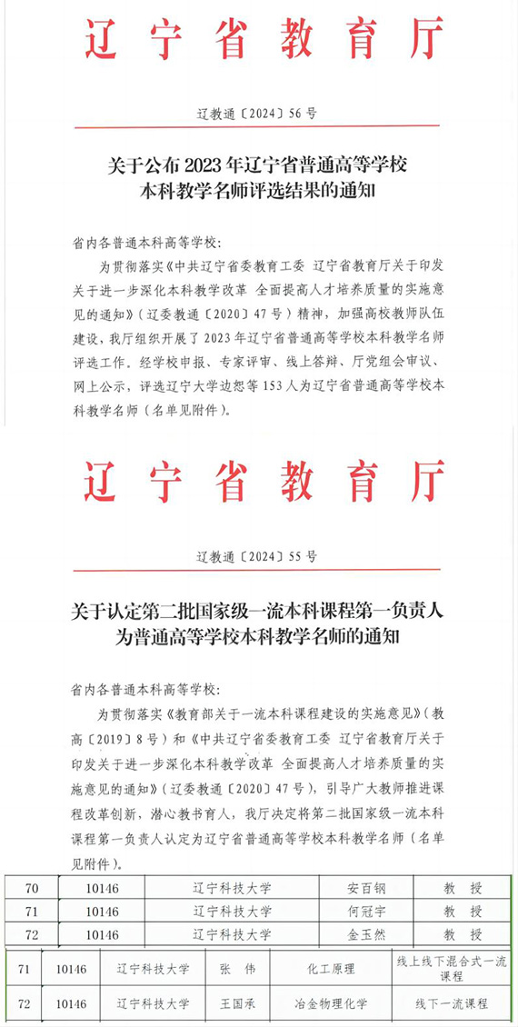 近日,根据辽宁省教育厅《关于公布2023年辽宁省普通高等学校本科教学名师评选结果的通知》(辽教通〔2024〕56号),ayxty.com化学工程学院安百钢教授、工商管理学院金玉然教授、艺术学院何冠宇教授获评2023年辽宁省普通高等学校本科教学名师。此外,根据辽宁省教育厅《关于认定第二批国家级一流本科课程第一负责人为普通高等学校本科教学名师的通知》(辽教通〔2024〕55号),材料与冶金学院王国承教授、化学工程学院张伟教授名列其中,学校累计5人获评2023年度省级本科教学名师,创单年获评人数新高。