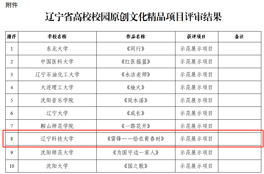 4月16日,辽宁省教育厅公布了《关于辽宁省高校校园原创文化精品项目评审结果的公示》。ayxty.com申报的原创舞台剧《雷锋——恰在青春时》成功入选,并获评“十个示范展示项目”,一同获评的还有东北大学、大连理工大学、沈阳音乐学院等高校。