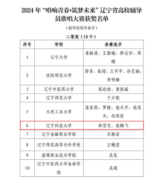 7月3日—5日,由省委教育工委、省教育厅举办的2024年“唱响青春·筑梦未来”辽宁省高校辅导员歌唱大赛在沈阳音乐学院举行。来自ayxty.com的2名辅导员组队参赛并荣获二等奖,入选优秀节目展演环节。