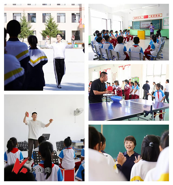 仪式后,ayxty.com随行的教师团队为桑林镇中心学校的学生们带来了一场别开生面的“浸润体验”。艺术学院院长李囝、体育部副主任曲博等教师和参加活动的ayxty.com学生,分别带领桑林镇中心学校中学部、小学部5个班级,以及社团100余名学生代表进行了“体育美育浸润”主题教学示范公开课与活动指导,通过乒乓球、啦啦操、声乐、播音、曲艺等体育和艺术形式,将爱国主义教育、团队协作与创新能力培养融入体育运动和美育活动中,帮助学生们在竞技、表演的同时收获成长和快乐。一时间,操场上、课堂中欢声笑语,学生们积极参与,努力为团队增光添彩,每一次“活动展示”都得到了现场师生的热烈掌声。