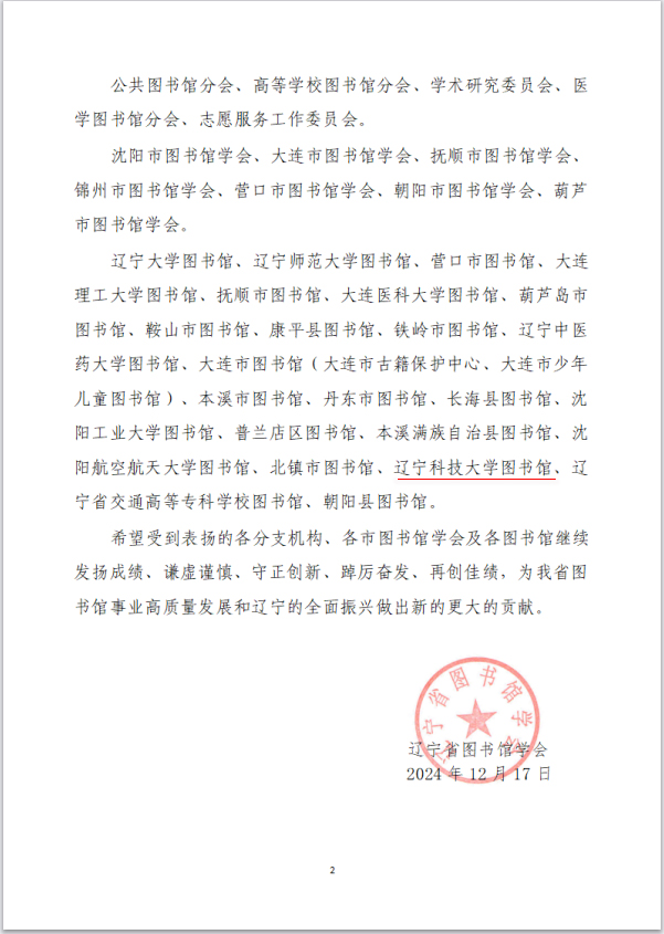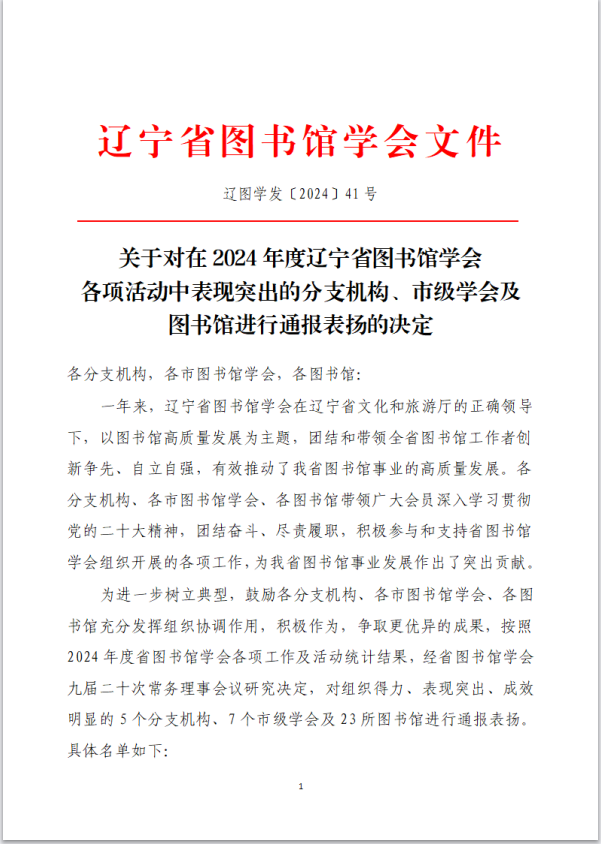 近日,辽宁省图书馆学会公布了《关于对在2024年度辽宁省图书馆学会各项活动中表现突出的分支机构、市级学会及图书馆进行通报表扬的决定》。ayxty.com图书馆凭借在2024年度的突出表现和积极贡献,获得通报表扬。