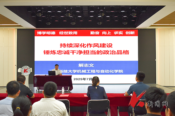 会议在庄严的国歌声中拉开帷幕。学院院长解志文主讲“持续深化作风建设,锤炼忠诚干净担当的政治品格”专题党课,他从加强党的作风建设的重要意义、贯彻落实中央八项规定精神、新时期学院建设发展的思考三个角度分享学习体会,希望全院师生党员坚定理想信念、强化履职担当,强化服务意识、弘扬奉献精神,强化规矩纪律意识、守住廉洁纪律底线,强化顶层设计与多位一体发展理念,全面推进“1+3+2”教育教学体系改革,坚持问题导向、脚踏实地精准施策,以高质量党建引领学院各项事业高质量发展。